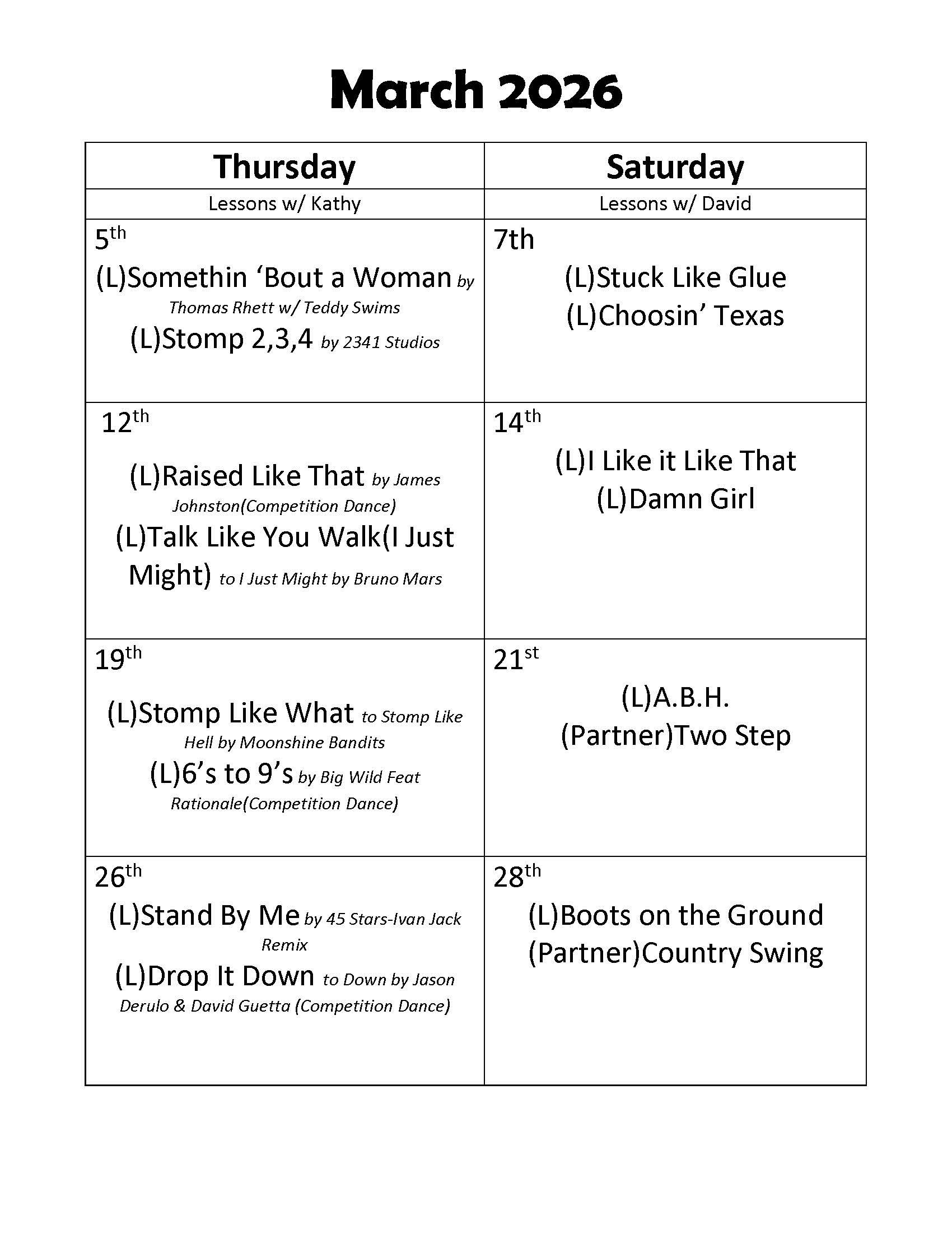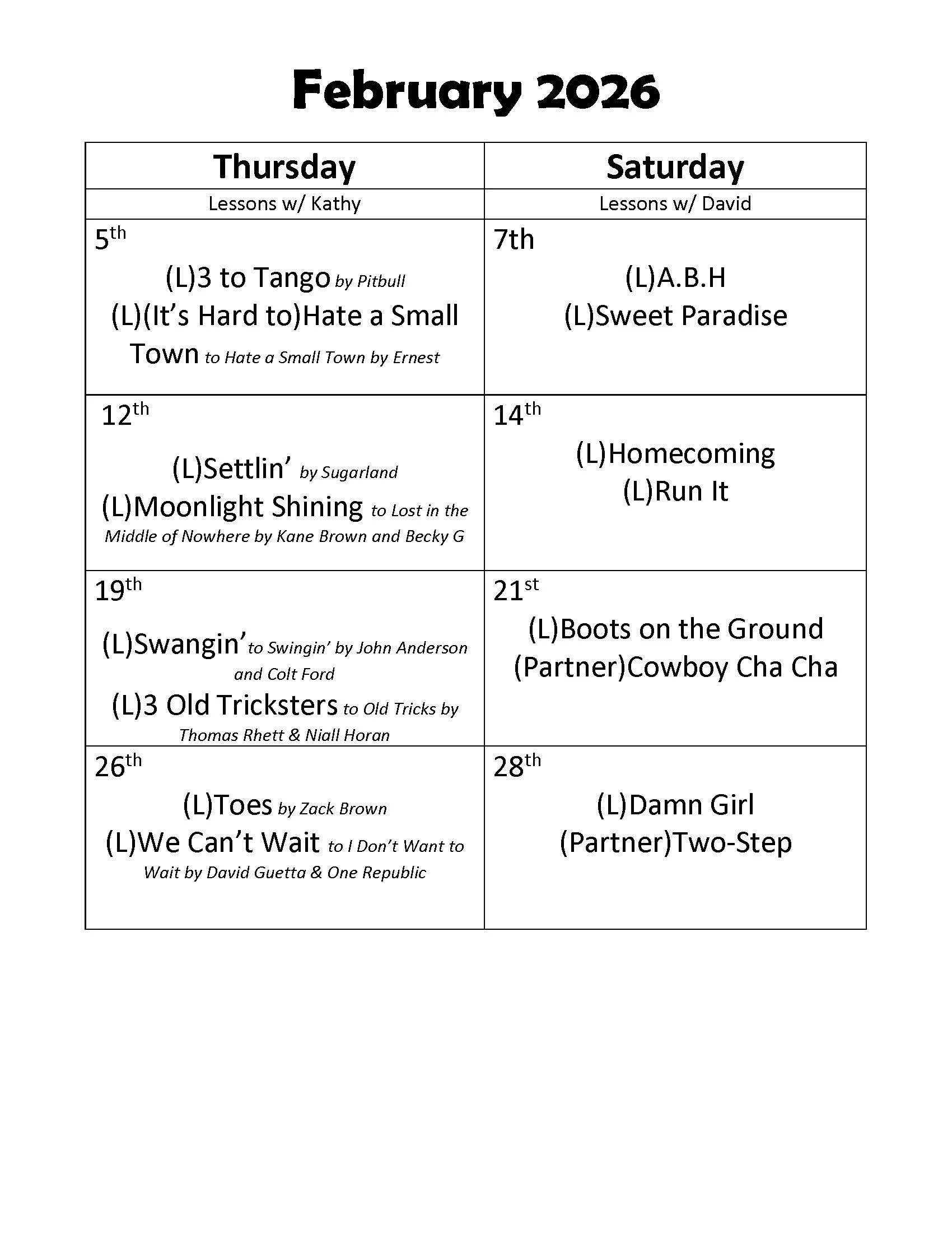 Thursdays lessons will be taught by Kathy on Thursday nights starting at 7:30p,